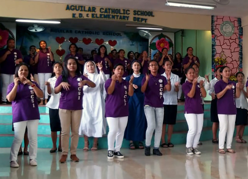 La Messe a été suivie d’un petit programme et d’un repas à l’école élémentaire catholique d’Aguilar. Une présentation Power Point sur l’histoire des Sœurs de Saint-Joseph de Cluny aux Philippines a été montrée. Ce fut un moment de convivialité mais aussi d’information pour la plupart de nos hôtes. Chacune de nos trois écoles a montré une présentation concernant les enseignants et les élèves. Les deux évêques présents ont donné un message témoignant de leur appréciation des ministères et de la créativité des Sœurs. Sœur Elizabeth nous a transmis le message de Sœur Allison. Plus de 300 personnes étaient présentes et toutes ont partagé un excellent repas pendant que le programme se poursuivait.