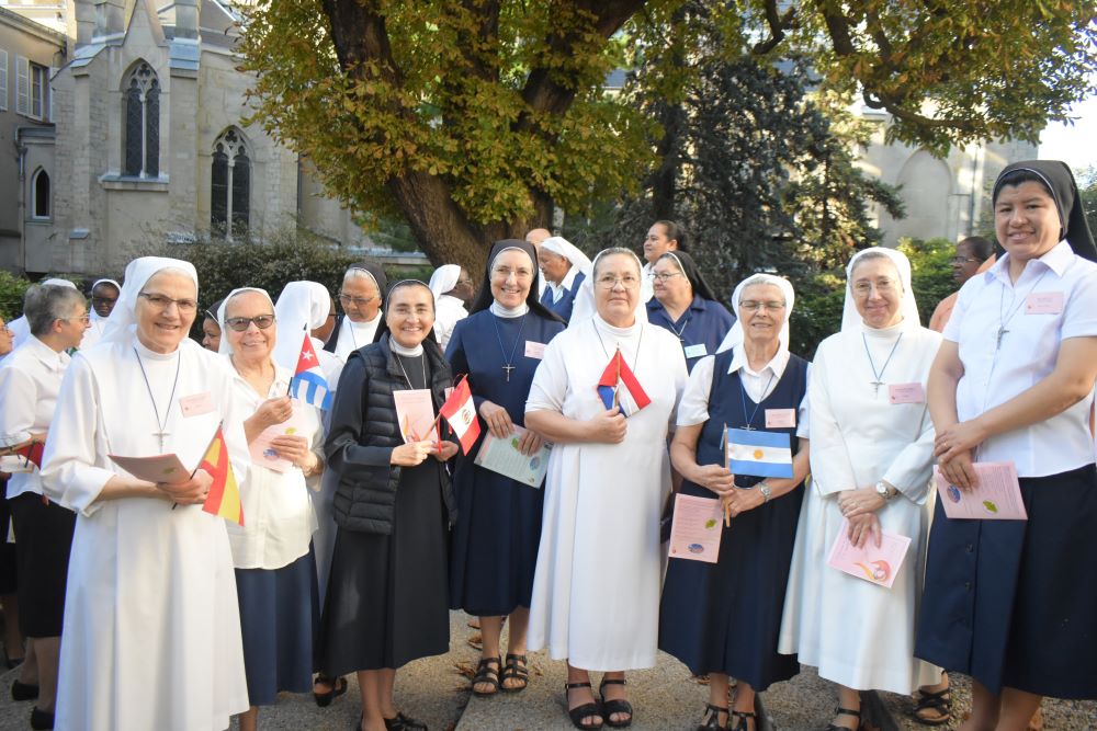 Las Hermanas Capitulares se dirigieron en procesión a la Gran Sala del Capítulo, llevando las banderas de los 55 países donde está presente la Congregación. El canto sobre el tema del Capítulo 2024, compuesto especialmente por una de nuestras hermanas, «Ensemble, Ensemble, Enflammons le Monde avec amour et espérance», («Juntas, Juntas, encendemos el mundo con amor y esperanza»), acompañó la procesión hasta la Sala Grande.