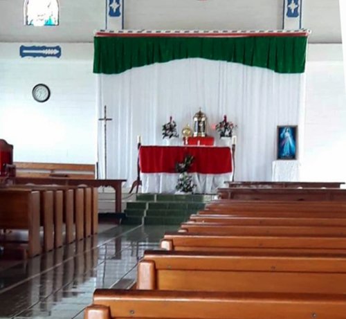 A minha equipe utiliza o salão paroquial da aldeia de Vailele onde as Irmãzinhas dos Pobres têm uma casa para idosos. Enquanto eu atendia as pessoas que chegavam para serem vacinadas, ouvi cantar e fui rezar um momento na igreja, onde estava exposto a Santíssimo Sacramento.