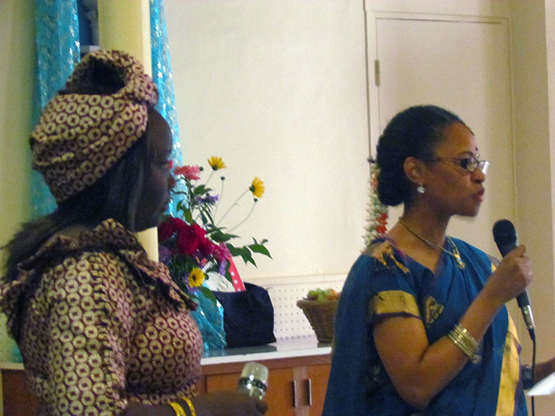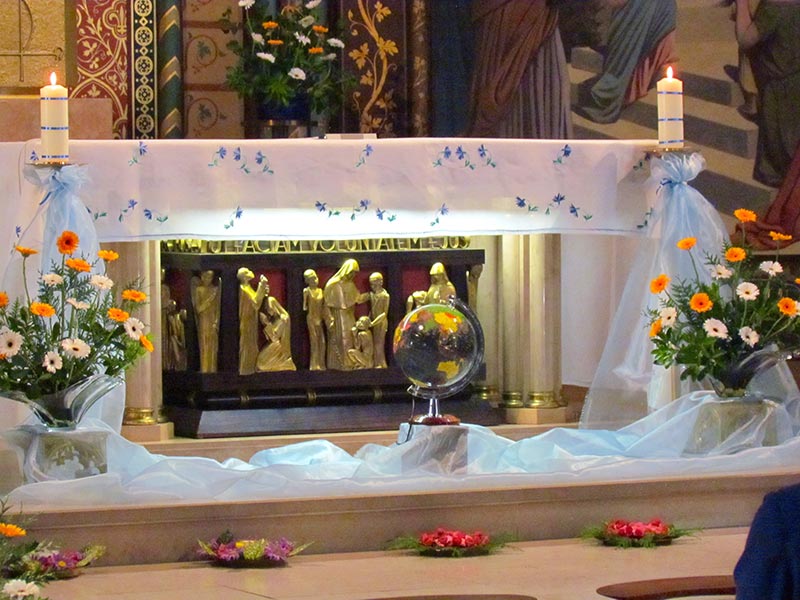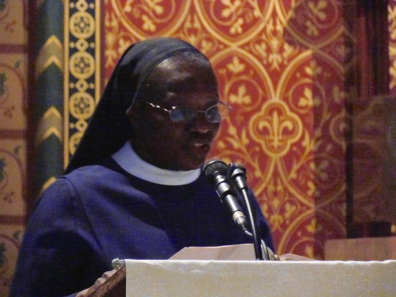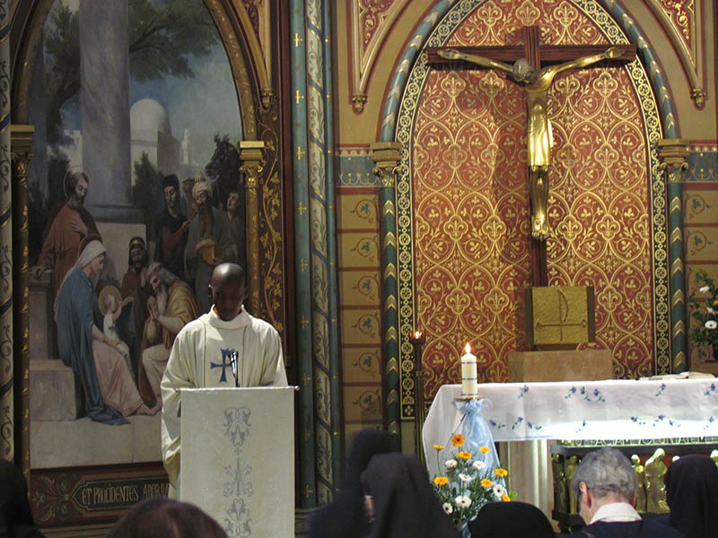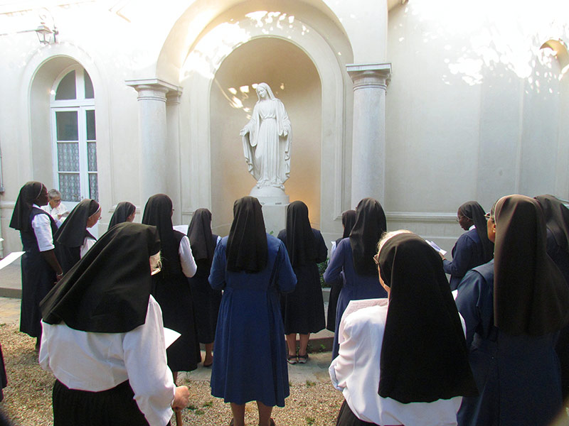 En fin de matinée, à 11h30 le Père Rémy…prêtre des Missions africaines a présidé la célébration eucharistique qui a rassemblé des sœurs venues des communautés voisines. Le petit chœur de la Maison Mère et d’autres voix ont chanté en français, anglais, espagnol, créole haïtien et créole africain de Sierra Leone ! Après la consécration, au moment de la doxologie, six sœurs de quatre nationalités : indienne, sénégalaise, guinéenne et haïtienne, ont exécuté le rite indien de l’ARATI . Ce fut une célébration joyeuse et priante aux couleurs, parfums et chants de tous les horizons à l’ image de notre Congrégation !