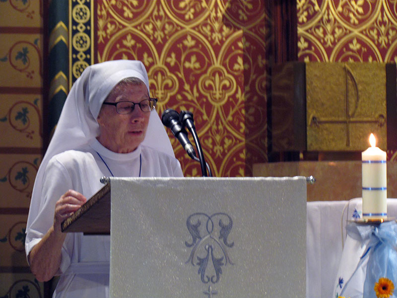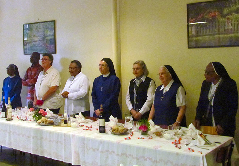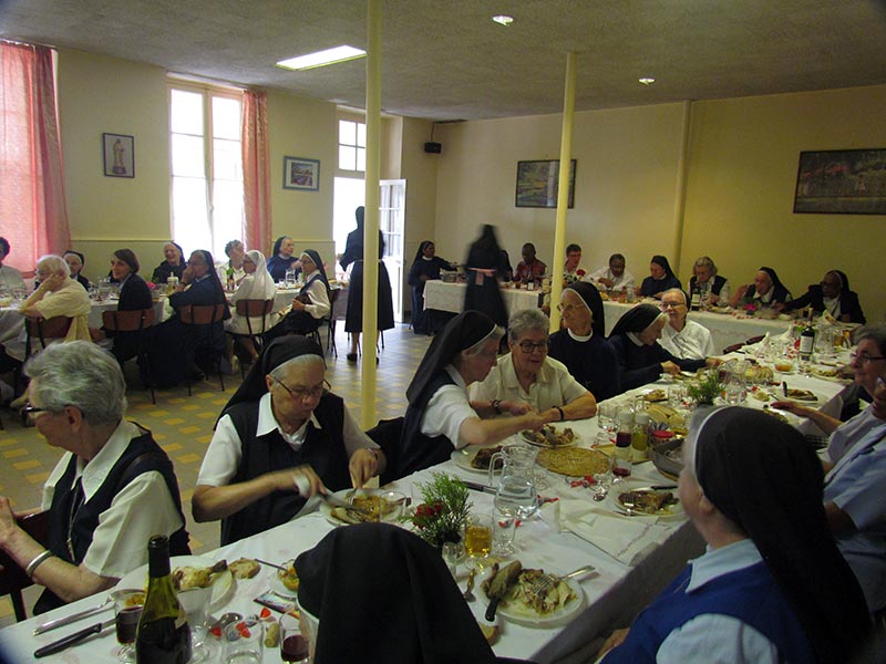 Après la messe un repas fraternel réunit un peu plus de 60 sœurs…Une équipe d’ animation digne des plus grands shows ! a mis tout en œuvre pour mettre en valeur les talents des unes et des autres : danses, chants, sketches… La joie était vraiment au rendez-vous ! A la fin du repas, Sœur Clare Stanley prit le temps de remercier la Communauté du Sacré-Cœur pour la messe, la partie récréative et tous ceux et celles qui ont travaillé dans les coulisses. Elle a remercié celles venues célébrer et fêter l’Assomption de la Vierge Marie et s’associer au temps de convivialité fraternelle. Elle a également remercié son Conseil présent et a rappelé que sa nouvelle mission n’était possible qu’avec toutes les Conseillères Générales. Plus que jamais nous savons senti et ressenti le « Cor Unum ».