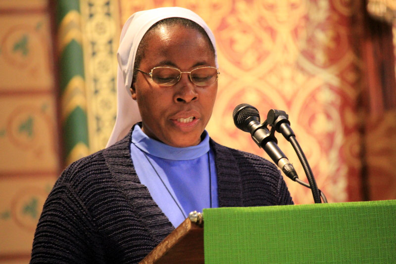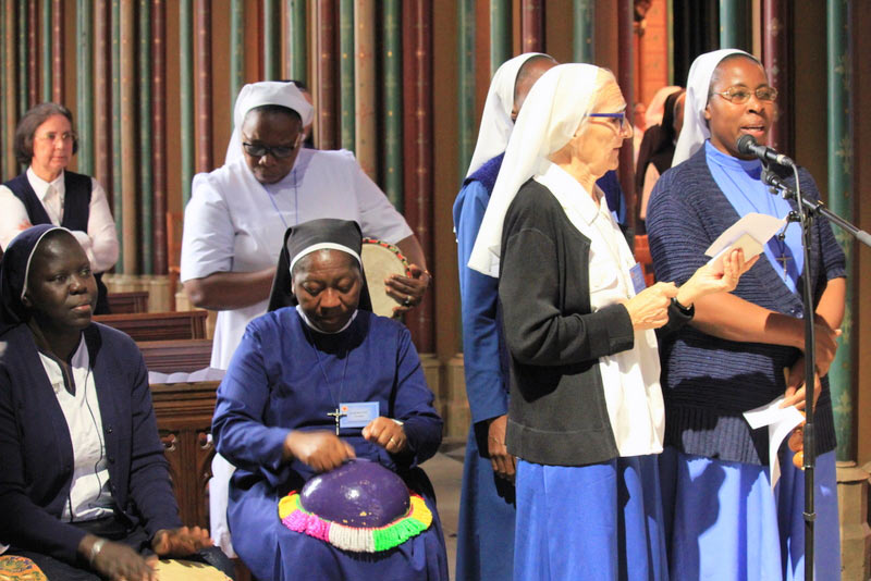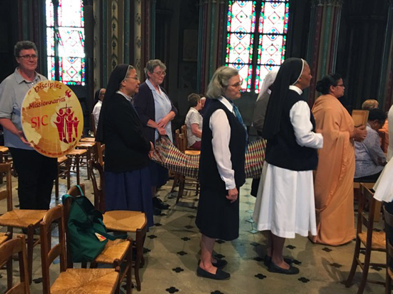 A Eucaristia de ação de graças às 18h00, começou com uma procissão iniciada pela Soeur Clare STANLEY, Superiora Geral, e a sua nova equipa eleita, levando uma vela acesa, uma bíblia, um pano tecido e o logotipo do Capítulo, simbolizando a ligação entre todos os membros da Congregação para manter a sua unidade. Depois de terem colocado estes símbolos no altar, invocou-se o Espírito Santo, nas quatro línguas, enquanto o celebrante as abençoava e aspergia com água benta.