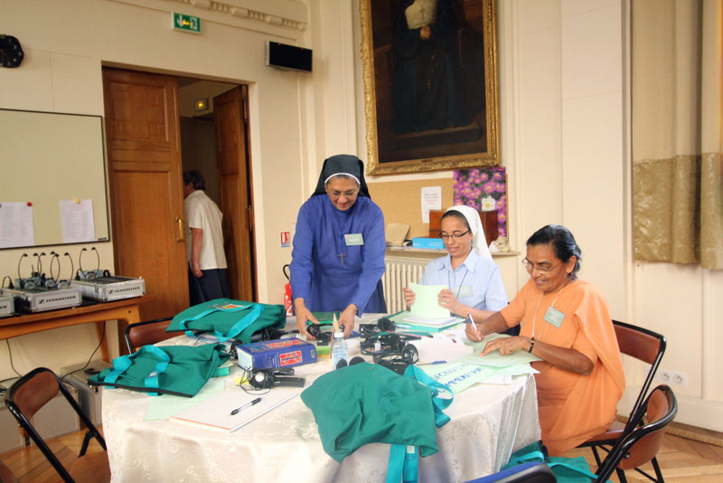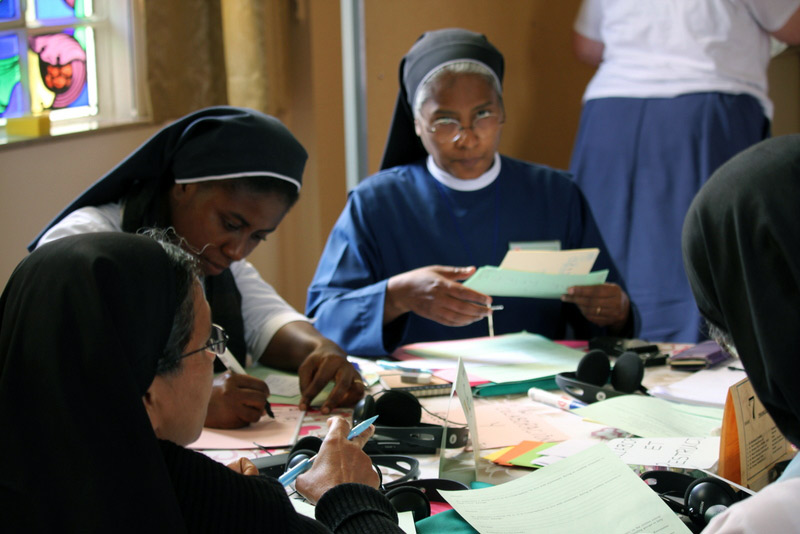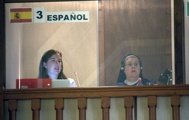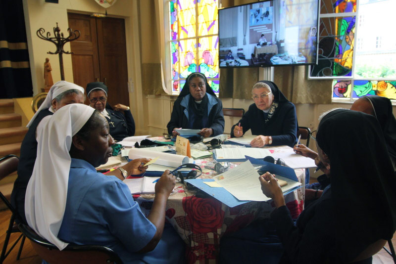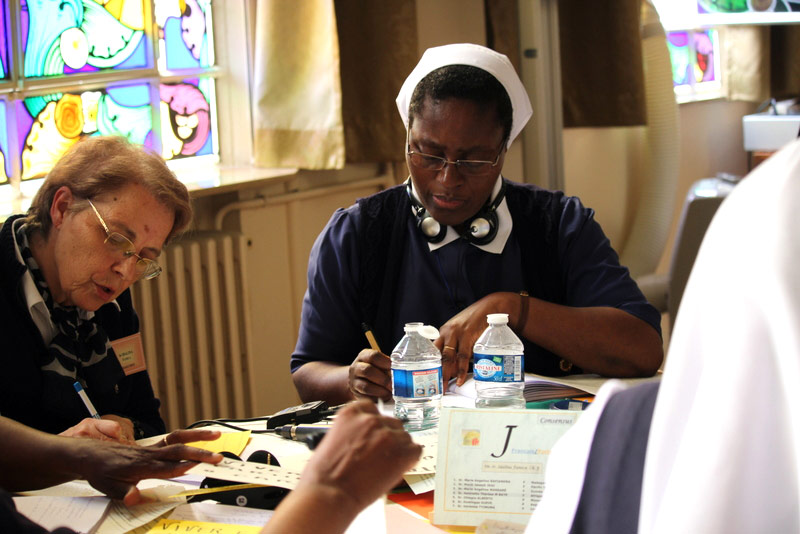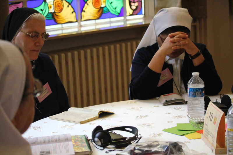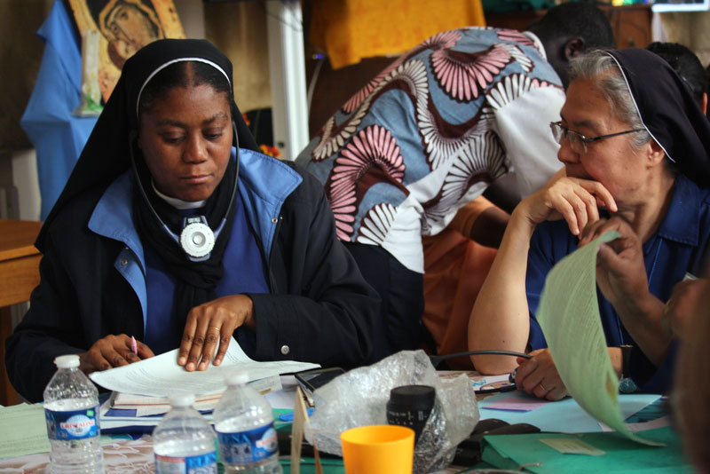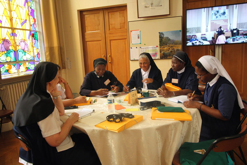 Depois de lidos, regressámos de novo à Grande Sala, às 14h30, em pequenos grupos, para continuar a refletir nas três principais prioridades que nos conduzirão às orientações, para a Congregação, para os próximos seis anos . Cada grupo apresentou as suas três prioridades e as razões da sua escolha. As prioridades de cada grupo foram escritas em pequenas folhas de papel de diferentes cores consoante a língua, e afixadas nos placards de forma a poderem ser vistos por todas..