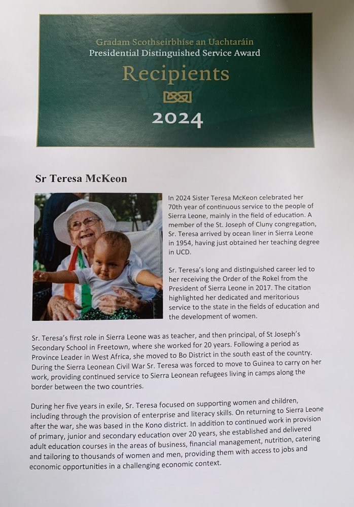 Le 30 janvier 2025, la cérémonie de remise du Prix du Président pour services distingués s’est déroulée en Irlande. Sœur Teresa étant d’un âge avancé et dans l’incapacité de se rendre en Irlande pour la cérémonie de remise des prix à Áras an Uachtaráin (la résidence officielle du président irlandais), Sœur Angela Bangura, provinciale de West Africa, a réceptionné le prix en son nom. Sœur Maeve Guinan, la Provinciale d’Irlande/Grand Bretagne, était également invitée à la prestigieuse cérémonie et au dîner au château de Dublin.